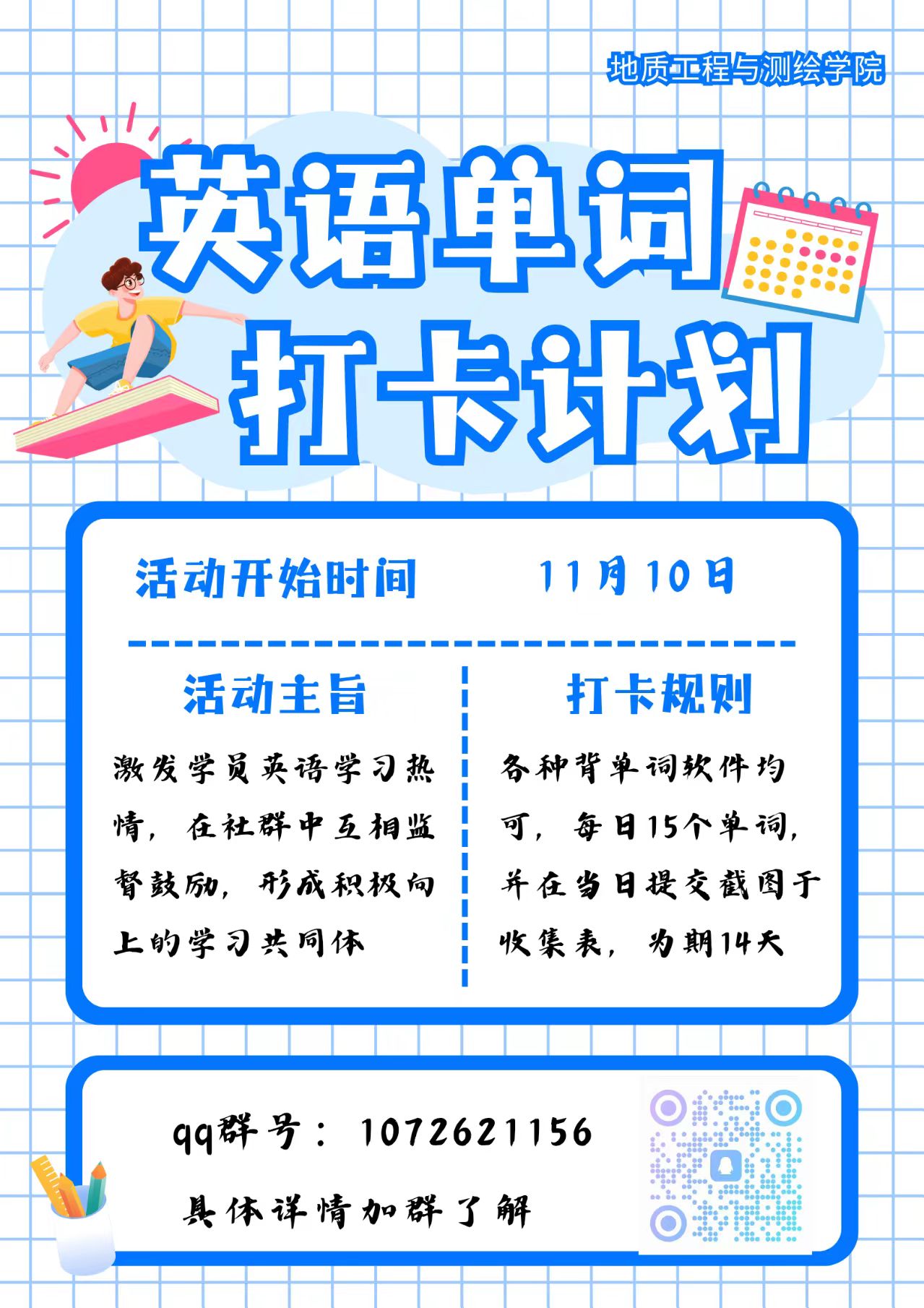 扫描下方二维码或搜索QQ群号:1072621156;入群后完善信息,开启你的14天单词挑战之旅!新葡的京集团35222vip学生会期待同学们的积极参与,加入我们单词打卡的行列,备战四级,拥抱更好的自己,迎接光明的未来