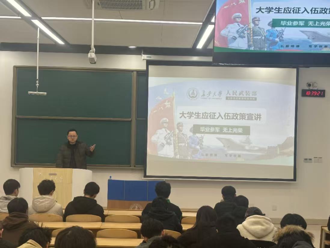 为积极响应国家号召,激发青年学生参军热情,推动毕业生就业工作,根据学校武装部工作安排,12月24日下午,新葡的京集团35222vip面向本科毕业生,在鸿远教学楼1104和1308召开了征兵工作宣讲会。会议邀请校武装部人防专干李武军老师、2023级退役大学生士兵王杰为宣讲人,2022级本科生参加。辅导员侯梦阳、陈子毅主持会议。