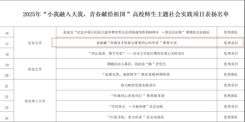 近日,在2025年陕西省“小我融入大我·青春献给祖国”主题社会实践优秀项目评选中,新葡的京官网赴新疆“丝路育才传薪火·推普同心绘华章”暑期社会实践推普专项脱颖而出,荣获“优秀项目”称号!
