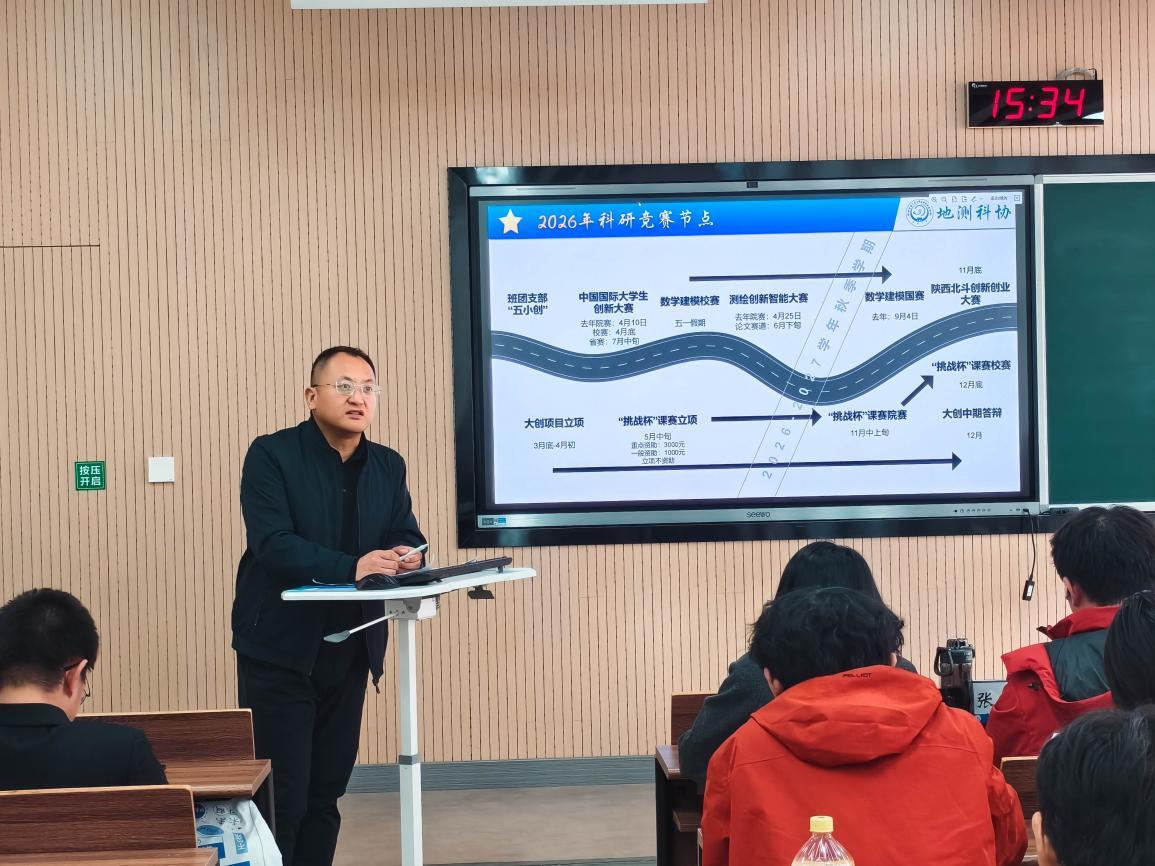 为促进新葡的京集团35222vip学院大学生科技创新创业协会(下简称“地测科协”)内部沟通交流,总结过去一学期工作成效并规划未来工作,地测科协于2026年3月22日14时在WX2209教室召开了2025-2026学年春季学期第一次全体例会。地测科协指导老师马见青、地测科协2025-2026学年执行主席张凯洋、主席团成员姜炤君、袁林桃、梁怡晨以及地测科协全体成员共同参会。会议由朱靖远主持。