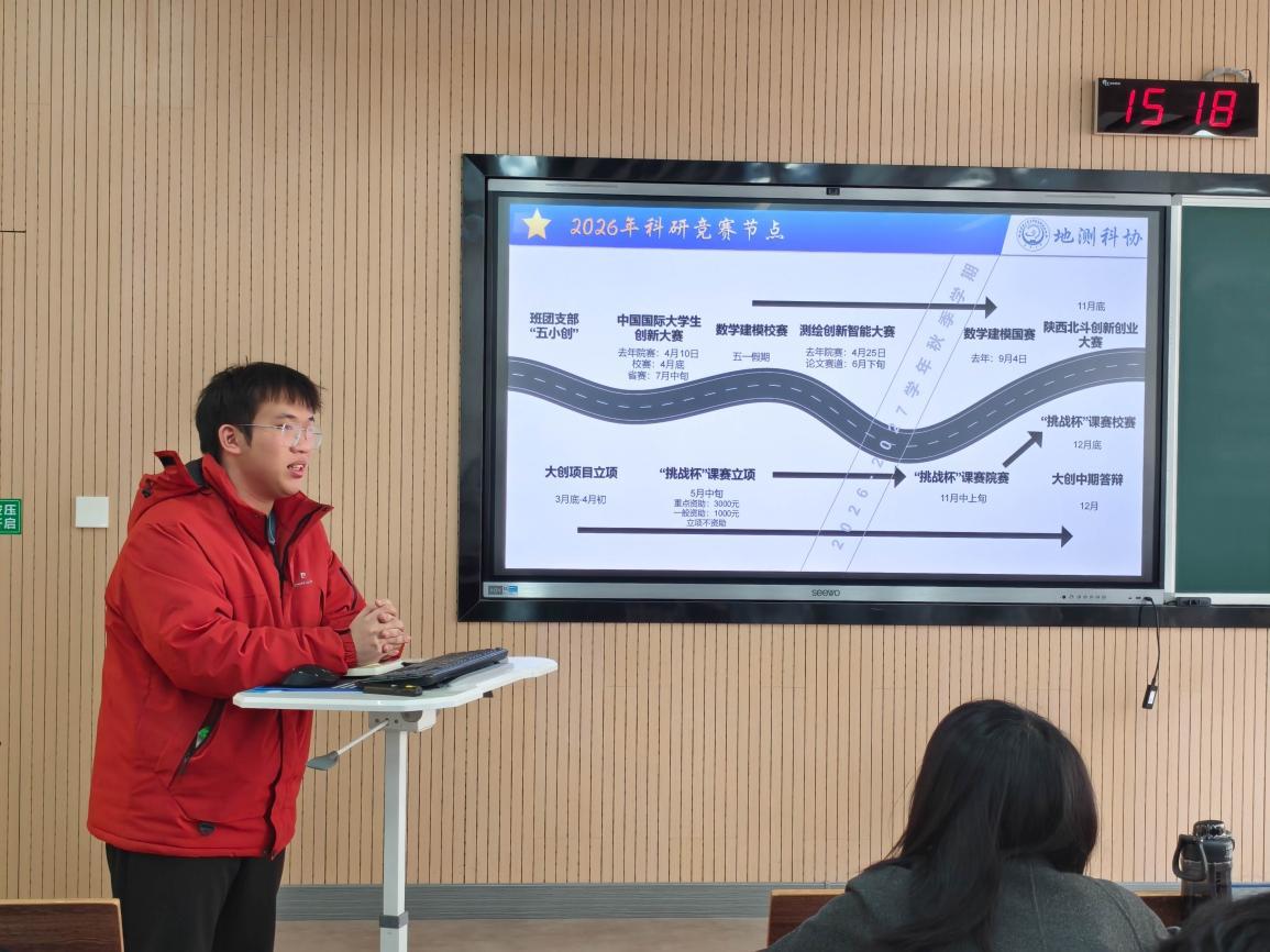 会议第二环节,由副主席梁怡晨发言。首先总结地测科协过去的工作成效并表达对未来发展的信心,其次详细介绍本学期工作安排及相关赛事时间,最后说明换届方式。发言中,他希望同学们保持科创热情,积累学科知识,积极参加竞赛,提高创新能力。
